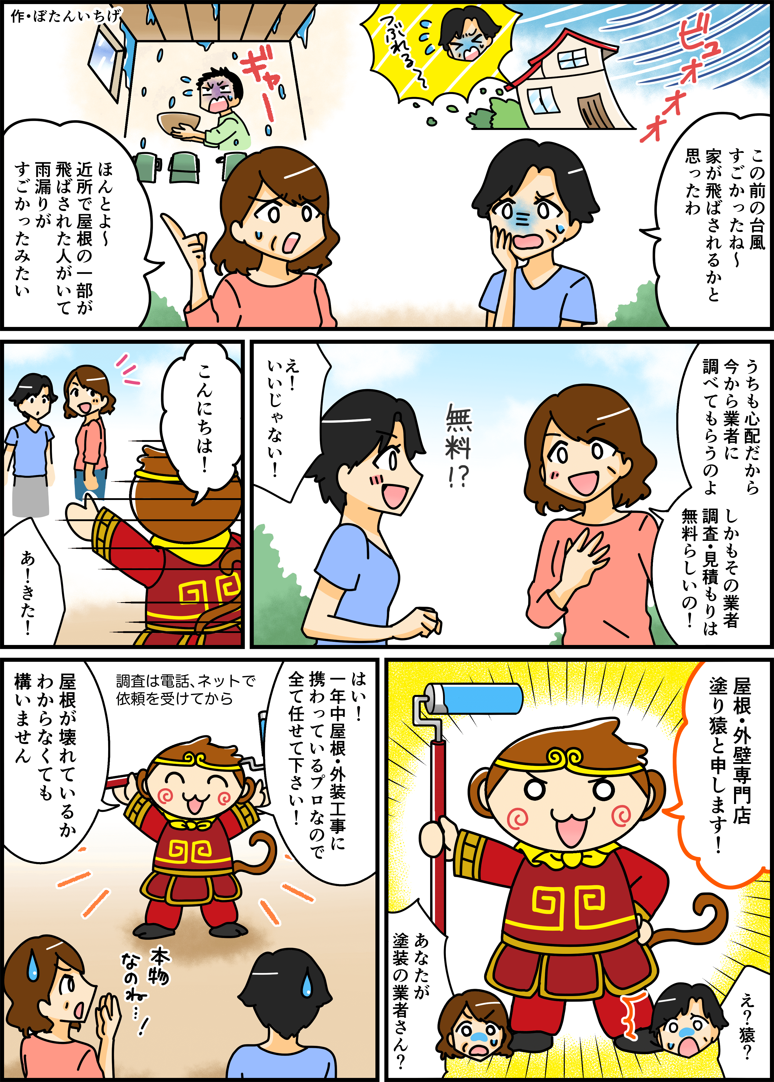 マンガ1 マンガ2 マンガ3 マンガ4 マンガ5 瓦の割れ、ズレ 屋根のサビ、色あせ 屋根の歪み、剥がれ 雨どいゆがみ、外れ 屋根は築8~12年たったら、 一度点検をお勧めしています。 どんなご質問にも、他店では教えてくれなかった話も 正直に、丁寧にご説明します!