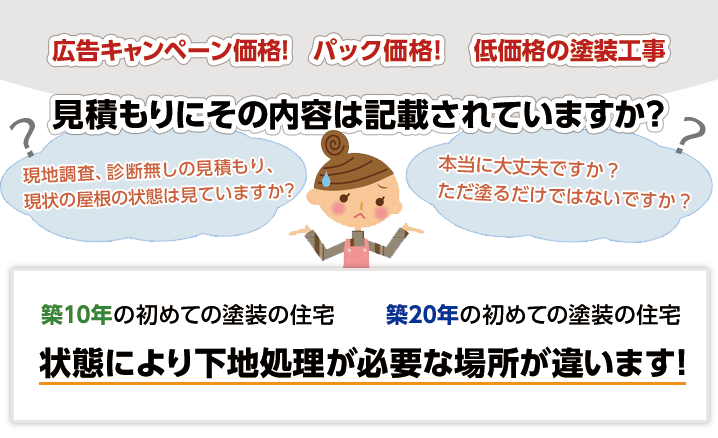わかりやすく例えると下地処理は女性のお化粧で言うところのスキンケアになります。お肌の調子が良くないと、どれだけ良い化粧品を使ってもノリが悪くなっていまいます。ですから、どのような素晴らしい効果をうたっている塗装であったとしても、見積時には「下地処理について説明してください」と言うことが大切です。