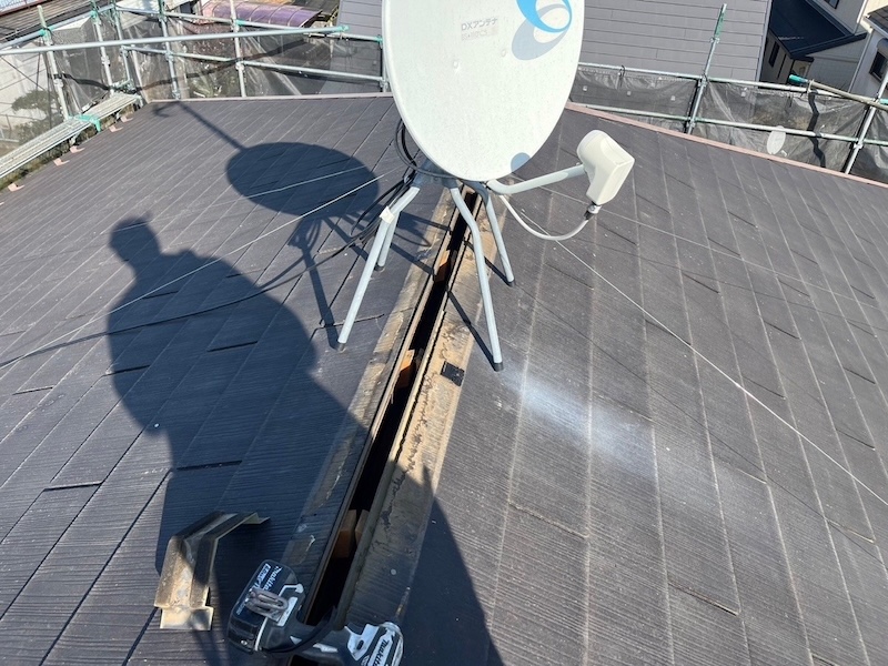 棟板金は施工に干渉するため撤去します。