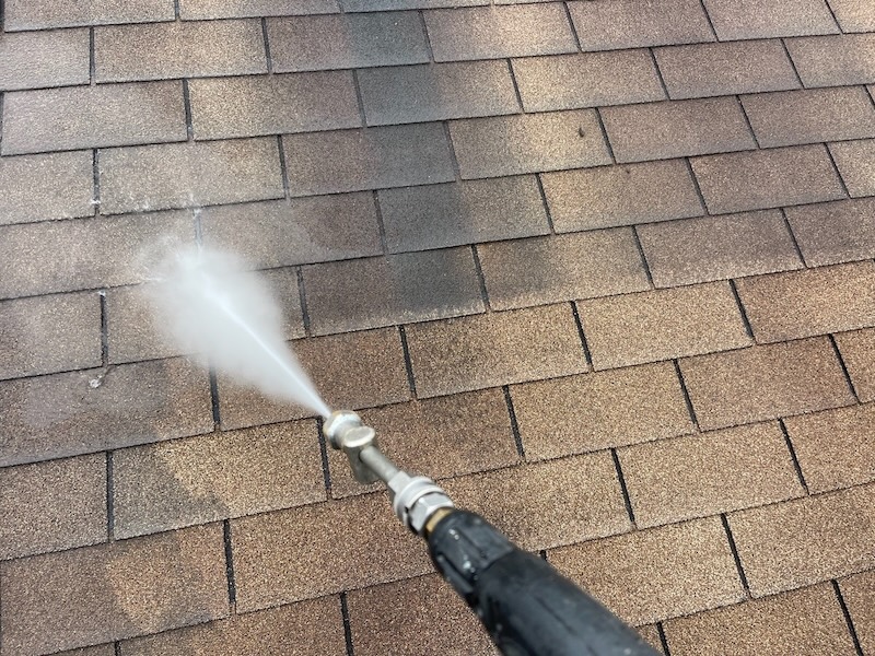屋根はアスファルトシングルなので、今回は塗装しませんが(板金のみ塗装します)、汚れたままだと見栄えが落ちてしまうので、洗浄していきます。